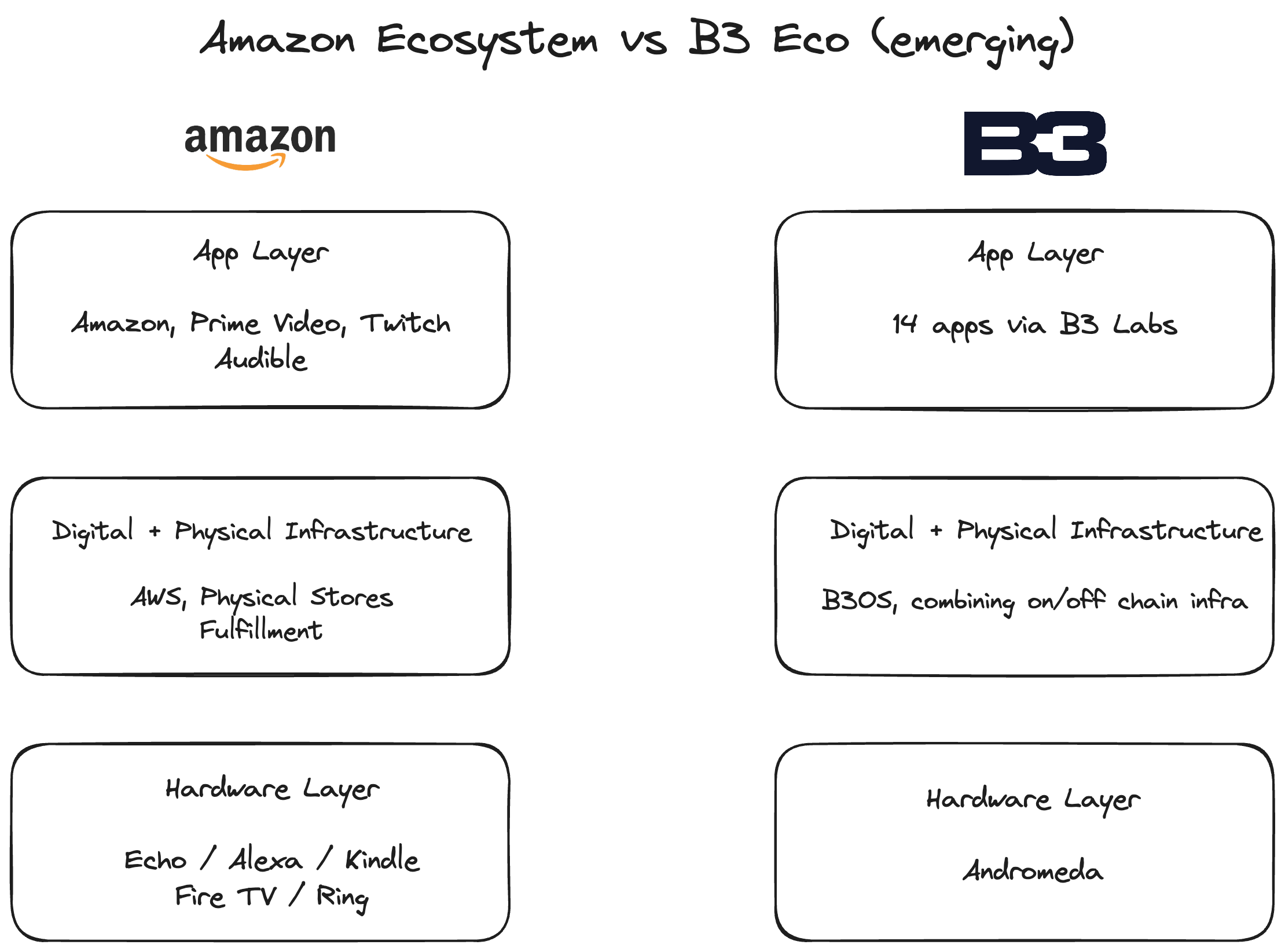 Amazon, in simple terms, built an app layer, an infrastructure layer, and a hardware layer. The app layer was things like Amazon retail, Prime Video, Twitch, and Audible. Underneath that sat the digital and physical infrastructure: AWS, physical stores, fulfillment, and logistics. Then there was the hardware layer: Echo, Kindle, Fire TV, Ring.