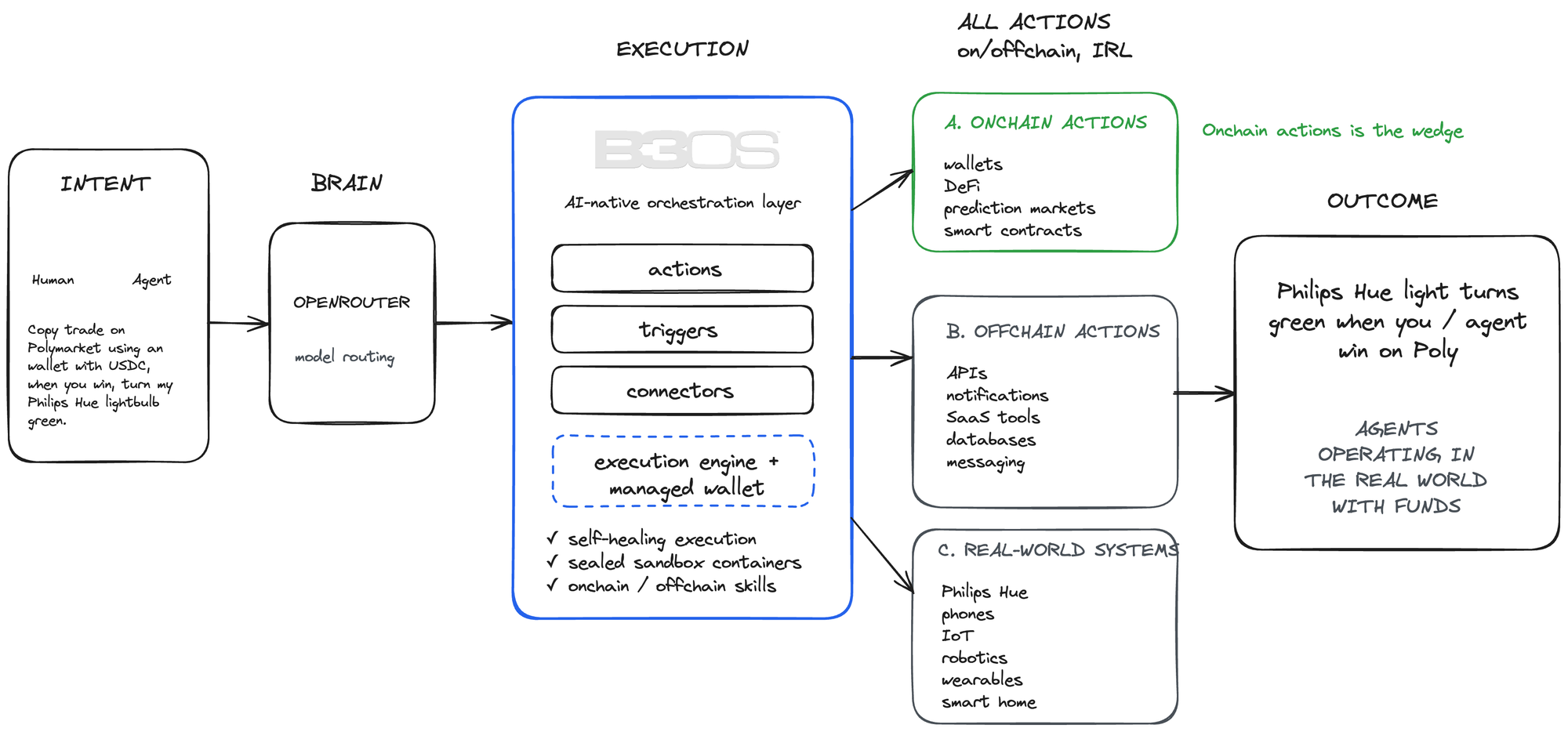 In our public beta, B3OS mostly looks like digital-to-digital activity. Automated workflows that coordinate DeFi actions, trade prediction markets, trigger notifications, and handle a bunch of the repetitive work. That is useful, but it’s just the wedge.